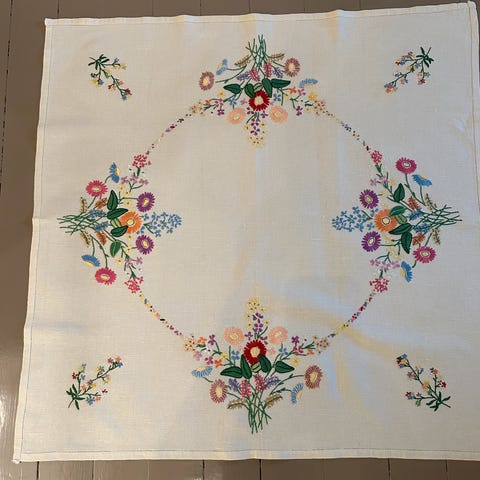 Duken er håndbrodert på lys ecru lin. Feilfri.