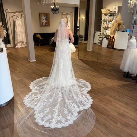 Bilde lånt fra Pronovias nett viser med åpent hals/bryste men det ha vært syd opp på hånd. Også justert med hånd rundt brystkasse å passer ca str 36. Lett å fjerne trådene å slep ut igjen til str 38 og åpne opp mellom brystene. Nydelig både åpent og sydd opp.
