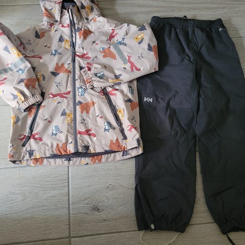 Supre overtrekksbukser! Har to stykk, som helst selges samlet. Vi hadde en på skolen og en hjemme. Lette å ta på/av, god passform, lommer, borrelås for stramming nederst og vannavstøtende (ikke vanntett). De er mye brukt på høst og vår, og de har noen bruksmerker (de ene trenger å sys på kneet og den andre er litt slitt helt nederst, se bildet), men fortsatt mye bruk, lek og moro igjen.