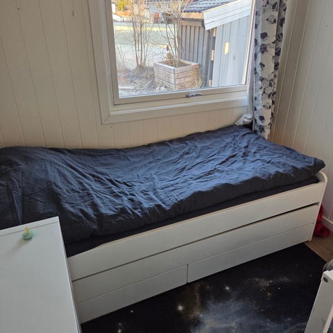 Jeg selger 2 stk hvite solide senger 90x200 fra Møbelringen. Vanlig bruksmerker. Ble brukt av et barn. Sengebunn og madrass følger med hvis ønskelig. 1000 kr hver. Hentes i Øyer.