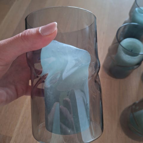 Lysfat brukt til kubbelys i bryllup. Glasig fra Ikea. Veldig diskret og gjorde lite av seg (sånn at blomstene kom mer frem).