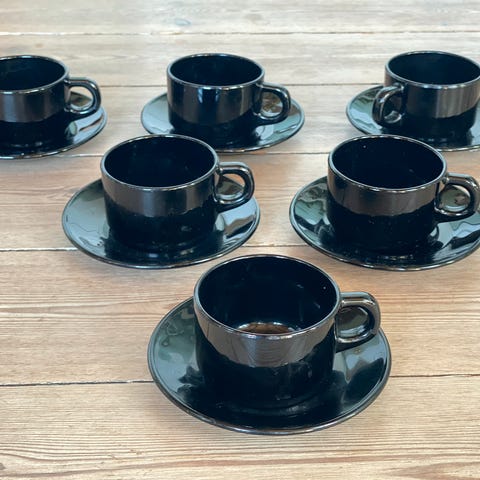Fire stilige retro espressokopper med asjett under fra Arcoroc France i sort. Nyvasket. Pent holdt og ubrukt av meg. Sort, glanset look. Oppbevart i skap.