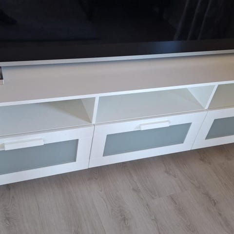 Brukt tv benk, noen små hakk, men vises ikke mye, ene hylle litt flekker, går kanskje bort?se bilde . Kjøpt hos Møbelringen.
