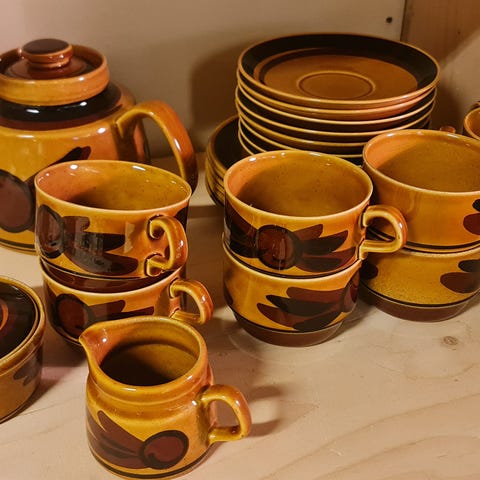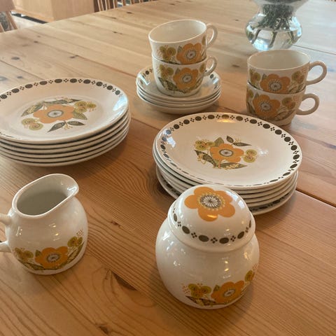 Sjarmerende, retro servise til 10 personer fra Schramberg Majolika Fabrik (SMF). Komplett med asjetter, kaffekopper, kaffeskåler, tekanne og fløtemugge.