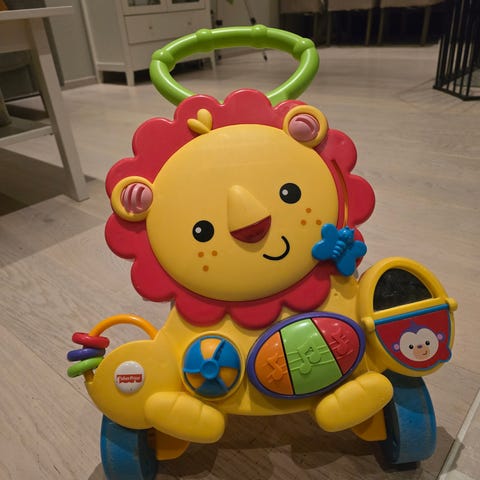 Aktivitetsleke og gåvogn i ett. Med mange små intr leker som fanger interessen fort og et søtt løve ansikt ble denne fort en favoritt i hus den tiden den ble brukt. Pent tatt vare på, vasket og vedlikeholdt.
