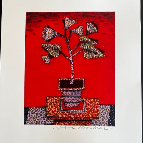 «Blomstring», brågrått farget eksemplar av bildet med mye god stemning. Morsomt serigrafi av Jan Baker selges.