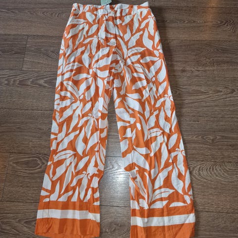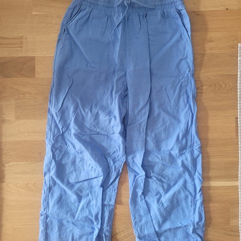 Vil si det er en sommerbukse da stoffet er tynnere enn i vanl jeans. Fasongen er luftig og ledig. Buksa er 90 cm lang med lommer foran. De ser lite brukt ut og er i god stand. Den kan hentes I Oslo eller benytte fiks ferdig.