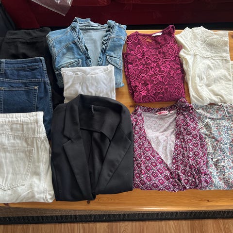 Selger stor sommer klespakke til dame. Passer til den som bruker str M. De fleste ting ble lite brukt eller de er helt nye. 5 shorts, 4 topper, 6 tynne gensere, 2 par trenings bukse, 3 par jeans, 5 bomullsgensere, 1 kjole, 1 natta kjole.