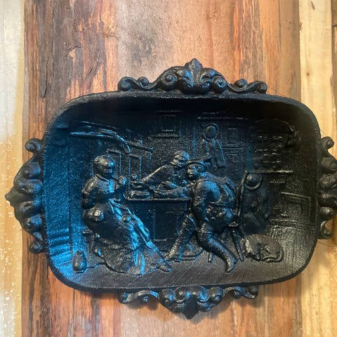 Relieffet er tungt og gir et kraftig, maskulint og rustikt uttrykk. Det har et tydelig oppheng på baksiden for veggmontering, men den konkave formen gjør at det også er perfekt som et unikt askebeger eller en skål for småting.