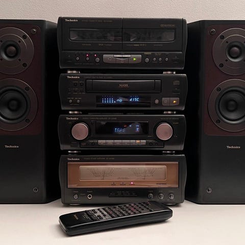 Høyttalerene er litt merket av alderen, med synlig slitasje.