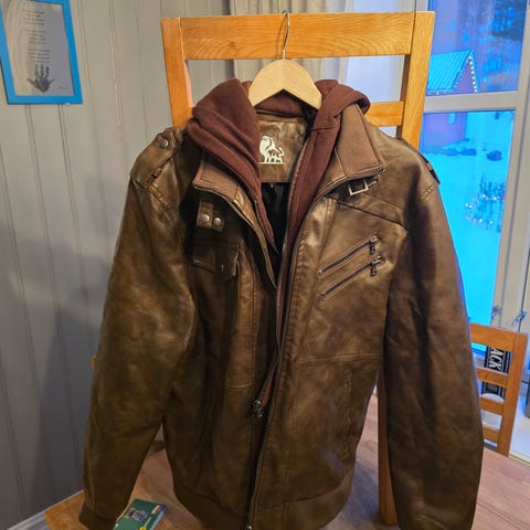 Selger en svart leather look jakke i Large videre for kroner 500,- pluss frakt