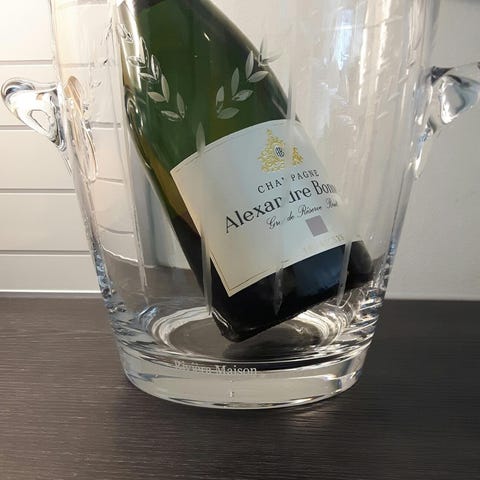 Krukke i glass fra riviera maison. Tror det er ment som en vinkjøler, jeg har brukt den som lyslykt/vase.