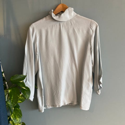 A good blouse for the office or going out, this lightweight shirt is made of 80% cotton and 20% silk. The pattern is a black tropical, almost mid-century modern print.