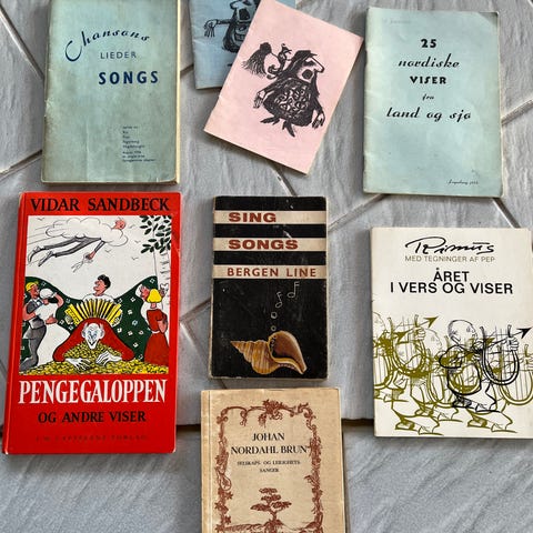 Wolfram Biermann og Viktor Jara: Et møte som aldri fant sted - 100 kr (SOLGT), Popmusikk - en historisk oversikt (hefte) - 100 kr. Evert Taube - sanger og noter - 100 kr. Dylan: Damer i regn - 70 sanger på norsk v. Jan Erik Vold - 100 kr. Kan ev. sende på den måten kjøper ønsker.