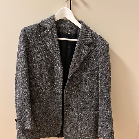 Blazeren kom dessverre ikke med lapper som viser størrelsen, men vil anta at det er en strl. L/XL. Ser ut til å være en blazer designet for menn, så om du er en kvinne vær oppmerksom på at den er større i skulderpartiet enn blazere designet for kvinner.
