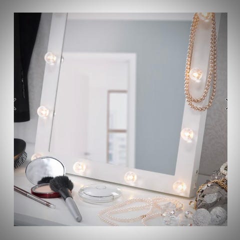 Utgått modell - men svært populær da den var i Ikea Bergen sitt sortiment. På høyre side går karmstangen ut, og der er knagger for halskjeder, nøkler etc. Så er det en 'kopp' for småting - og en mobil-holder.