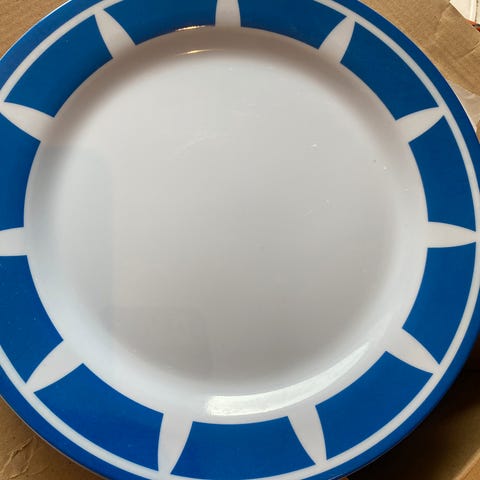 Selger to flate tallerkener Ø ca. 20 cm og to koppfat Ø ca. 15 cm fra Drage-serien (stempel: “ekte kinesisk steingods”). Hele og pene, men med normal bruks slitasje i glasuren.