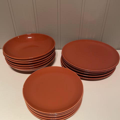 Pent og elegant kjøkken service fra ikea. En tallerken er det gått er skal av, men nesten ikke synlig. En dyp tallerken som har noen bruksmerker i seg, men ikke veldig synlig. Ellers som nytt. 8 av hvert.
