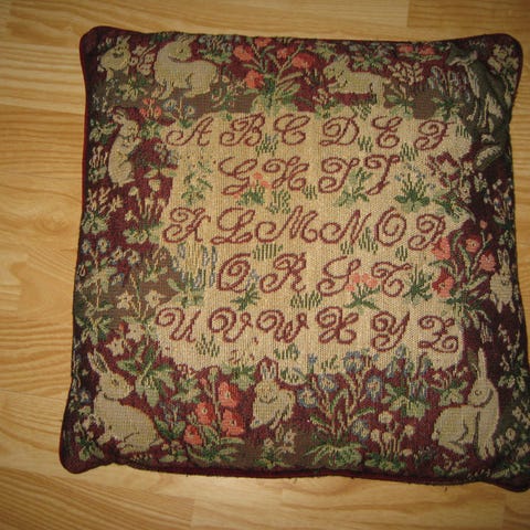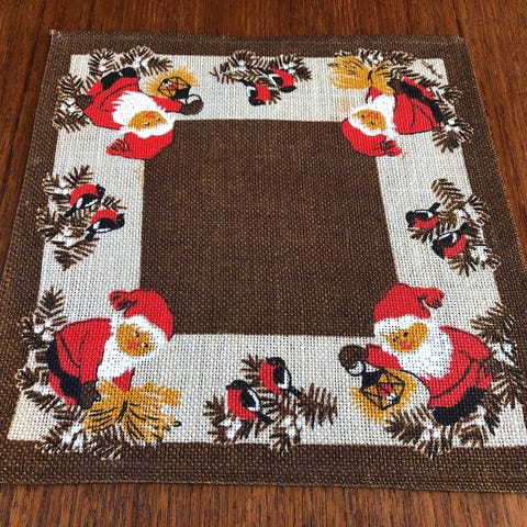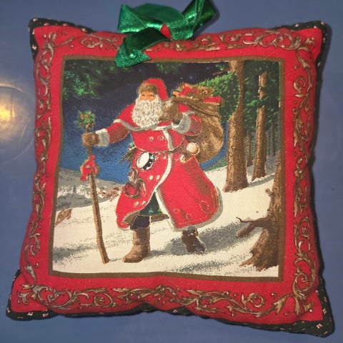 Har ei fin pynte pute med motiv av Julenisse som flyr Reinsdyr for salg . Størrelsen på denne er 39x36 cm . Denne er komplett med innerpute .