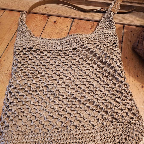 Heklet skulderveske i bomullsgarn med lang skinnhank. Går fint å ha på skrå over brøstet.