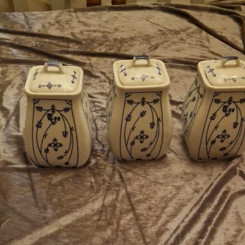 Flott samling av 5 krukker med lokk i topp tilstand fra Jäger Eisenberg med kjent og tidløs dekor. Samling består av krukker til kaffe, te, sukker, salt og mel. Selges helst samlet men kan vurdere å dele opp med kaffe, te og sukker eller sukker, mel og salt og kaffe te. Send melding så ser jeg på det. Samlet pris for samling er 2000kr.