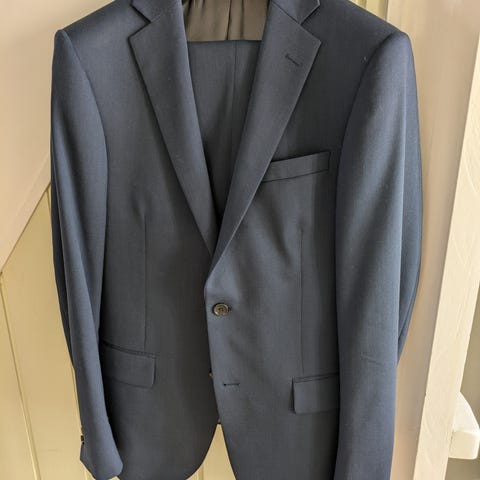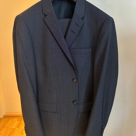 Dress fra Follestad, b52 er størrelsen på dressjakka som vill si at det er vanlig passform og størrelsen på buksa som er b104 betyr at lengden på buksa er kort. Selger dressen fordi den ikke passer meg lenger den har blitt sydd inn og litt ut noen steder, men går an å få fikset det hos en skredder. Er det noe mer du lurer på så er det bare å spørre.