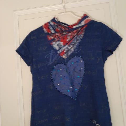 Super kul topp fra Desigual 🤩 Er ut som det henger ett skjerf utenpå. Med frynser. Helt ensfarget blå bak. Stretch. Kjøpt i London.