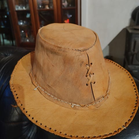 Den brune skinnjakken i saueskinn med glidelås og spennefester på kragen, baksiden utsmykket med gulmalt skrift «Memphis Belle» og et bilde av jenta på et fly. Etiketten inni lyder Memphis Belle Ltd, Original Designs, 1990 The Bountiful Company, TM Warner Bros Inc, 100 % ekte saueskinn, Laget i England.