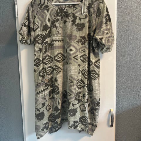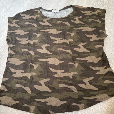Med sitt grå-hvite kamuflasjetema passer den flott til hvite jeans eller en skjorte. Den har V-hals, korte ermer, og baksiden er litt lengre enn foran og ender i to spisser.