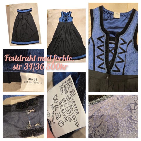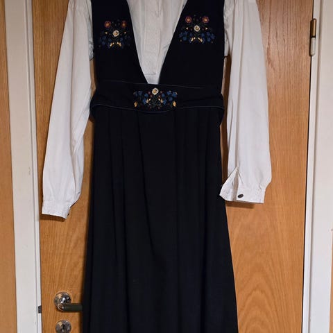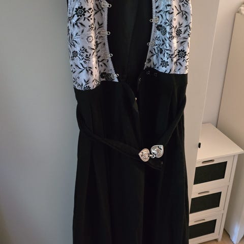 Festdrakt fra Cubus, rød mønstrete overdel med blomstrete mønster på svart belte og veske. Beltet er justerbart med borrelåser. Underdel er svart med et rødt mønstrete bånd neders på drakten, samme mønster som det er i overdel. Cape er av merke Friends størrelse 12 år. Selges samlet og pent brukt.