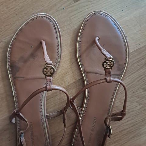 Disse gule semskede Tory Burch-plattformsandalene har raffiadetaljer og ankelstropper. De leveres med sin originale stoffveske med Tory Burch-grafikk. Størrelse 37.