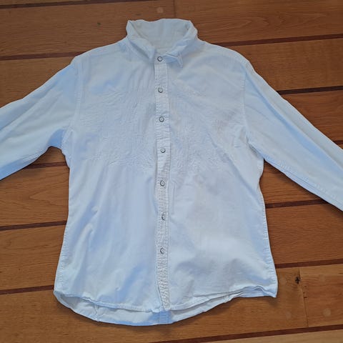 Stilig design med knappelukking ved halsen og brodert logo foran.