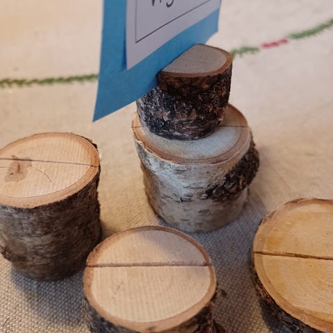Litt div pynt, bordkortholdere, skilt(klistremerke kan tas bort), duk, kunstige blomster.