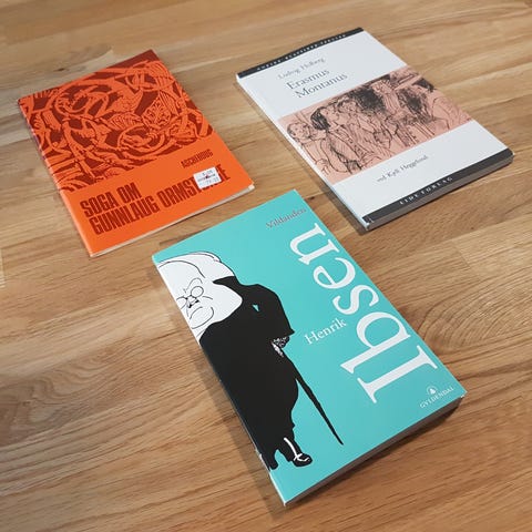 Selger en stabel bøker på dansk. Både pocket og innbundne.