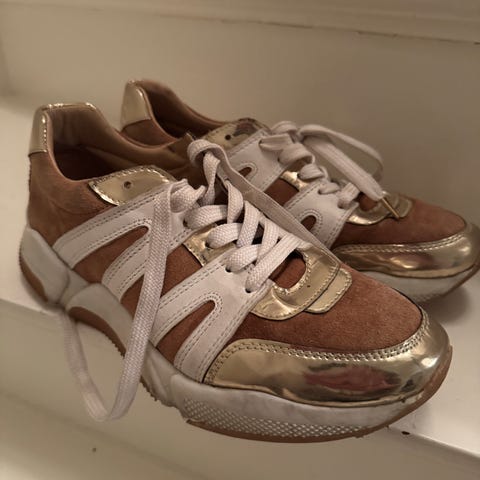 Kronos sneakers i størrelse 40. Modellen er i hovedsak hvit med detaljer i gull på hælkappe og logo. Skoene har snøring foran og flat såle i hvit gummi. Overdelen ser ut til å være i syntetisk materiale. Egnet som hverdagssko og fritidssko.sendes mot frakt