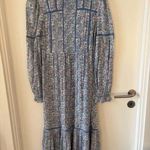Vurderes solgt. Nydelig lang sommerkjole med skjortekrage, belte og knapper hele veien ned. Krage på ermene kan også brettes inn for variasjon. Løs og vid passform uten belte. Kun brukt et par ganger