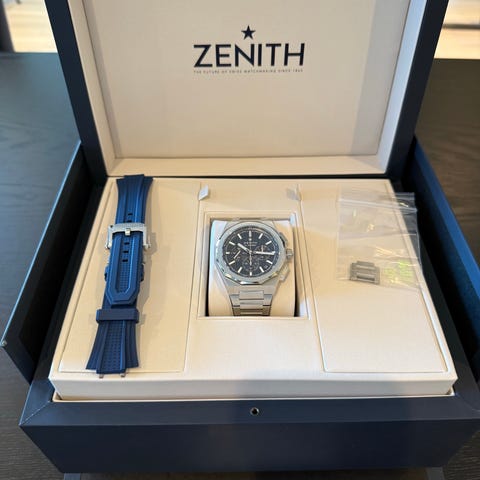 Zenith Defy Classic. Uret har en nydelig blå skive som har ett fantastisk fargespill i lyset.