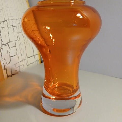 En flott liten vase signert Willy Johansson for Hadeland. 15 cm høy. Normale bruksspor og slitasje, men fortsatt dekorativ.