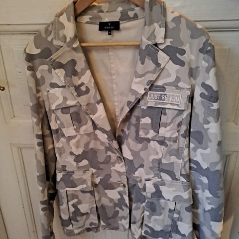Unik jakke fra Monikmo, nett modell med tungt broderi på ryggen. Hver jakke er ulik og broderistykket kommer fra afghanske brudekjoler. Se siste bildet for noen manglende perler, eller ingen feil. Ny pris 4000 kr.