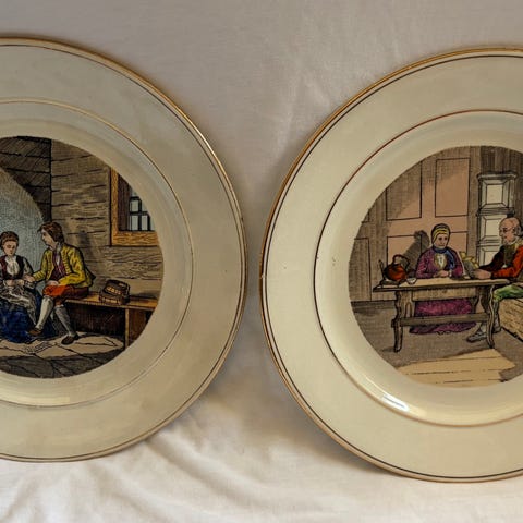 1. Alle de 4 middagstallerkene har forskjellige motiv, forskjellige kunstmalere (painted) og gravører (engraved), se bildene, alle signert, og har forskjellige tekster. Alle har flotte farger, dessverre har en et nag eller merke på kanten, se siste bilde for nr. 4 i serien. Ellers er alle hele og pene, kun noe spor av alder og krakelering.