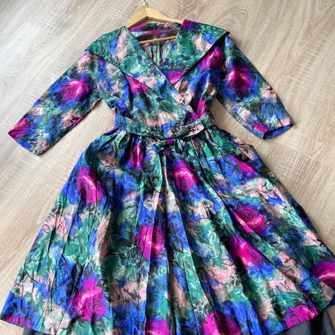 Vintage :Design kjole, Finn Karelia .Fargerikt stoff i god kvalitet