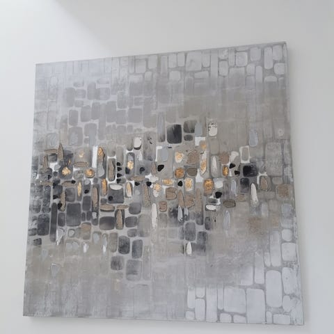 Selger et vakkert og håndlaget bilde kjøpt i Nederland. Motivet viser små speilbiter som gir en glitrende og levende effekt. Bildet har en elegant sølvgrå bakgrunn og speilramme som passer perfekt inn i et moderne interiør.
