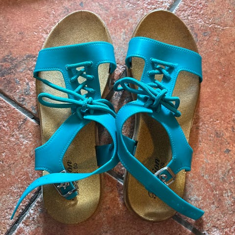 Gladiator Sandaler Trendy, flate i lys beige. Gull spenne og nagler med sølv kant nede ved sålen og over foten. Unike . Veldig fine på foten.str.38 kr .200