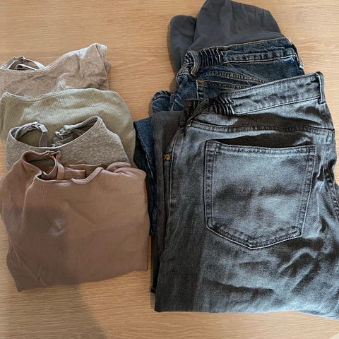 En sort «olabukse», to tights med baklommer og en olashorts for gravidmagen. Den ene tightsen fremstår som godt brukt, resten er ikke betydelig brukt. Selges samlet for oppgitt pris. Alle plaggene er fra H&M Mama og har god plass til en gravid mage