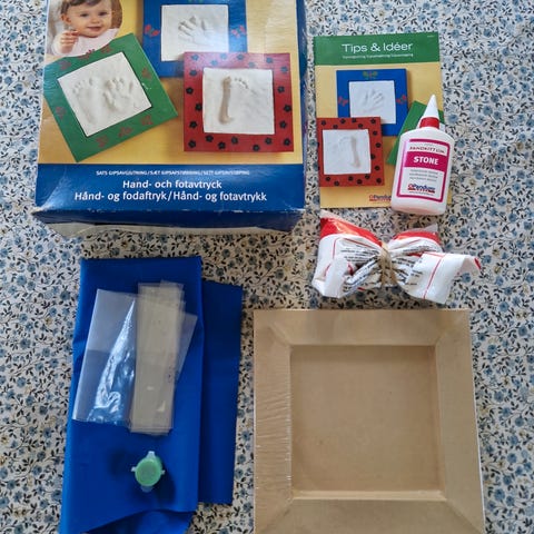 To små bilder for avtrykk av hånd/fot på nyfødt/baby. Oppheng og stempelfarge og pute medfølger. Står Ellinor, lille gullet til tante på. Panda motiv.