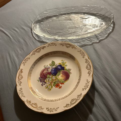 Et nydelig koboltblått serveringsfat, fiskefat for laks, ørret eller annen mat, selges. Fatet er produsert av ''Acanthus Risør Norway'' og er i glasert keramikk, stentøy. Motivet er en innrisset og påmalt stilisert fisk i gul, grønn farge. På baksiden er det hull for oppheng på vegg. Størrelsen er: ca. L47 x B19 x H5 cm og vekten er: ca. 1,2 kilo. Jeg har to stykker og kan selge begge for kr. 480,-