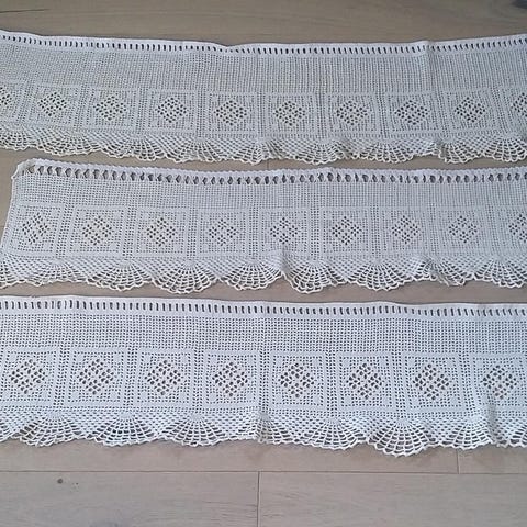 2 like, hvite, heklede gardinkapper. 1,70 × 0,48 m.
