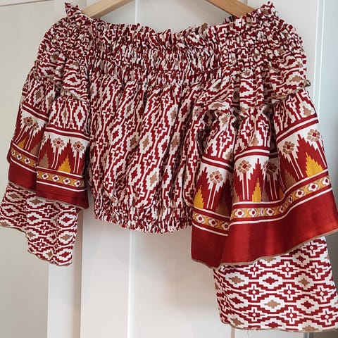 Cotton off shoulder shirt with bow detail on the sleeves.