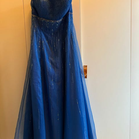 Nydelig ballkjole fra Faviana New York i turkis farge, med fine stendetaljer og knyting i ryggen. Amerikansk størrelse 9/10, tilsvarende 38/40 norsk størrelse.