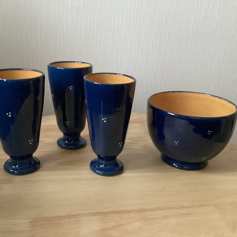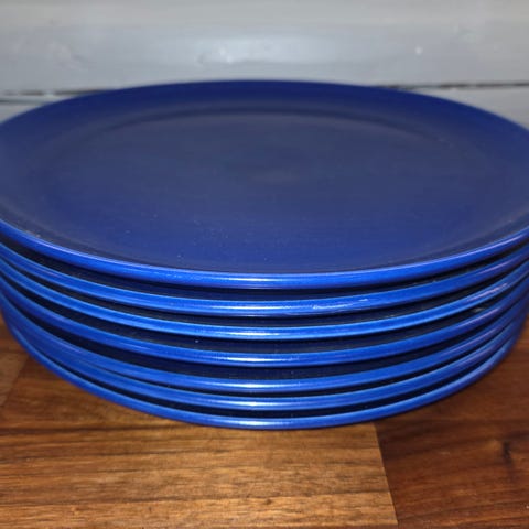 Keramikkservice, 1 bolle 23,5 cm i diameter, 8 stk. 21 cm diameter tallerkener, 4 stk. 23,5 cm diameter tallerkener.Alt har blå glasur med innslag av lilla. Tallerkene er ikke brukt. De 8 tallerkene koster 50 kroner pr. stk, de 4 tallerkene koster 50 kroner pr. stk. og bollen koster 100 kroner, pluss frakt.